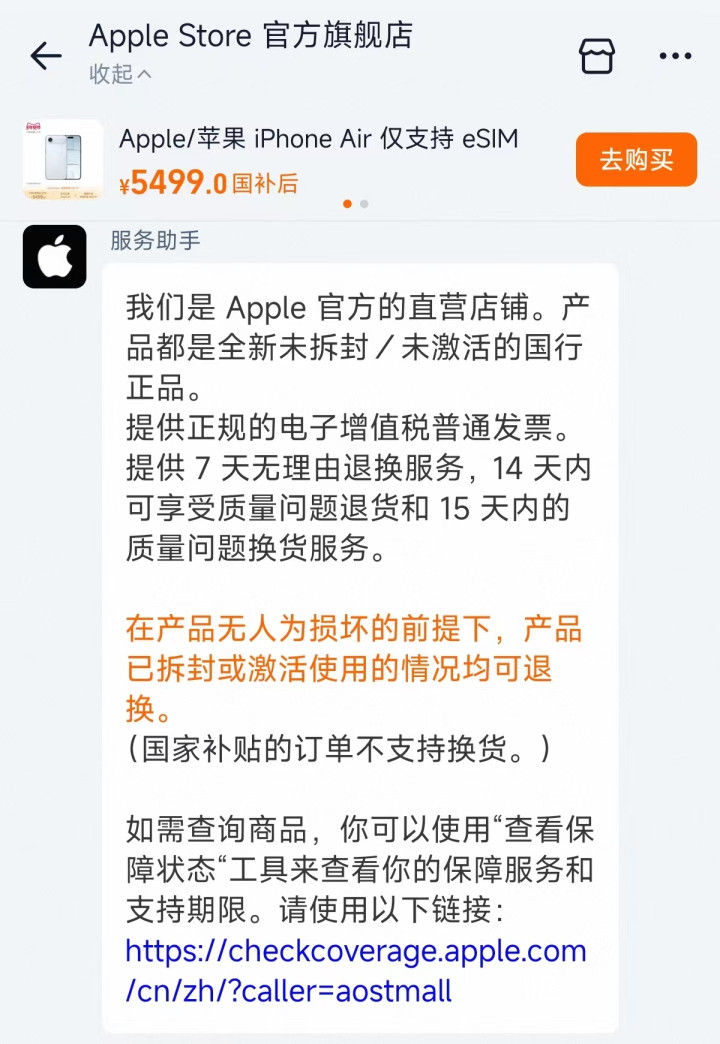 针对质疑,苹果客服强调产品是全新未拆封/未激活的国行正品,不是先有订单后生产产品,因此时间会有出入。此外,该客服还透露,设备发出前看不到实际情况,官方也没有库存机的说法。