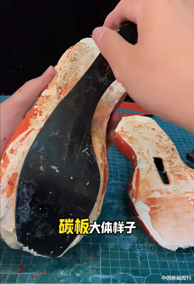 某跑鞋测评博主拆开碳板跑鞋鞋底黑色硬质物体为碳板图/视频截图